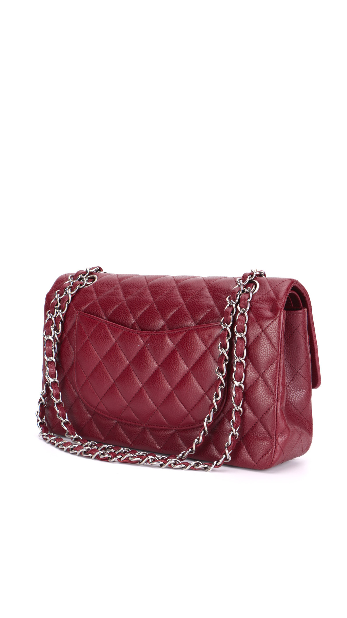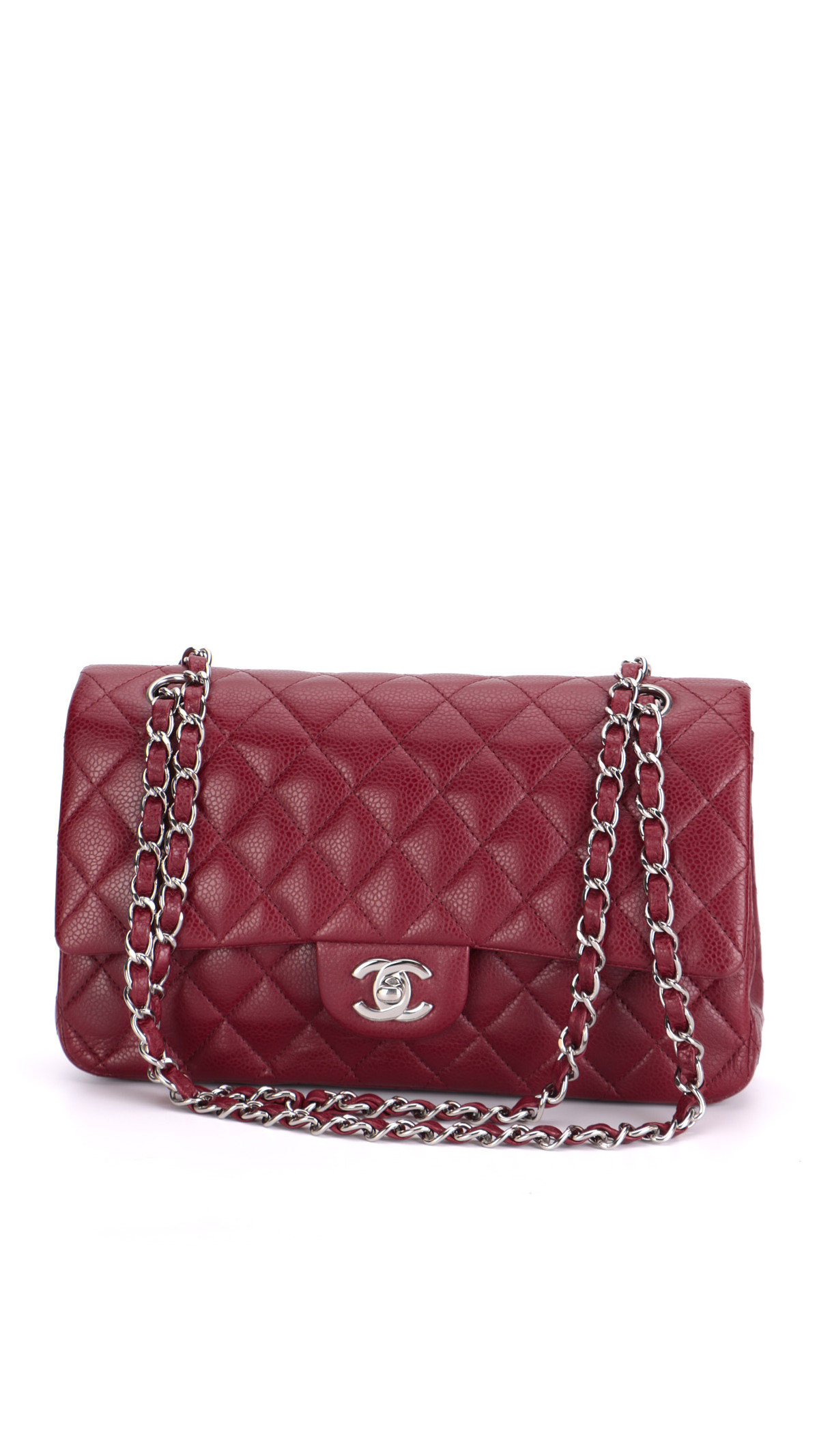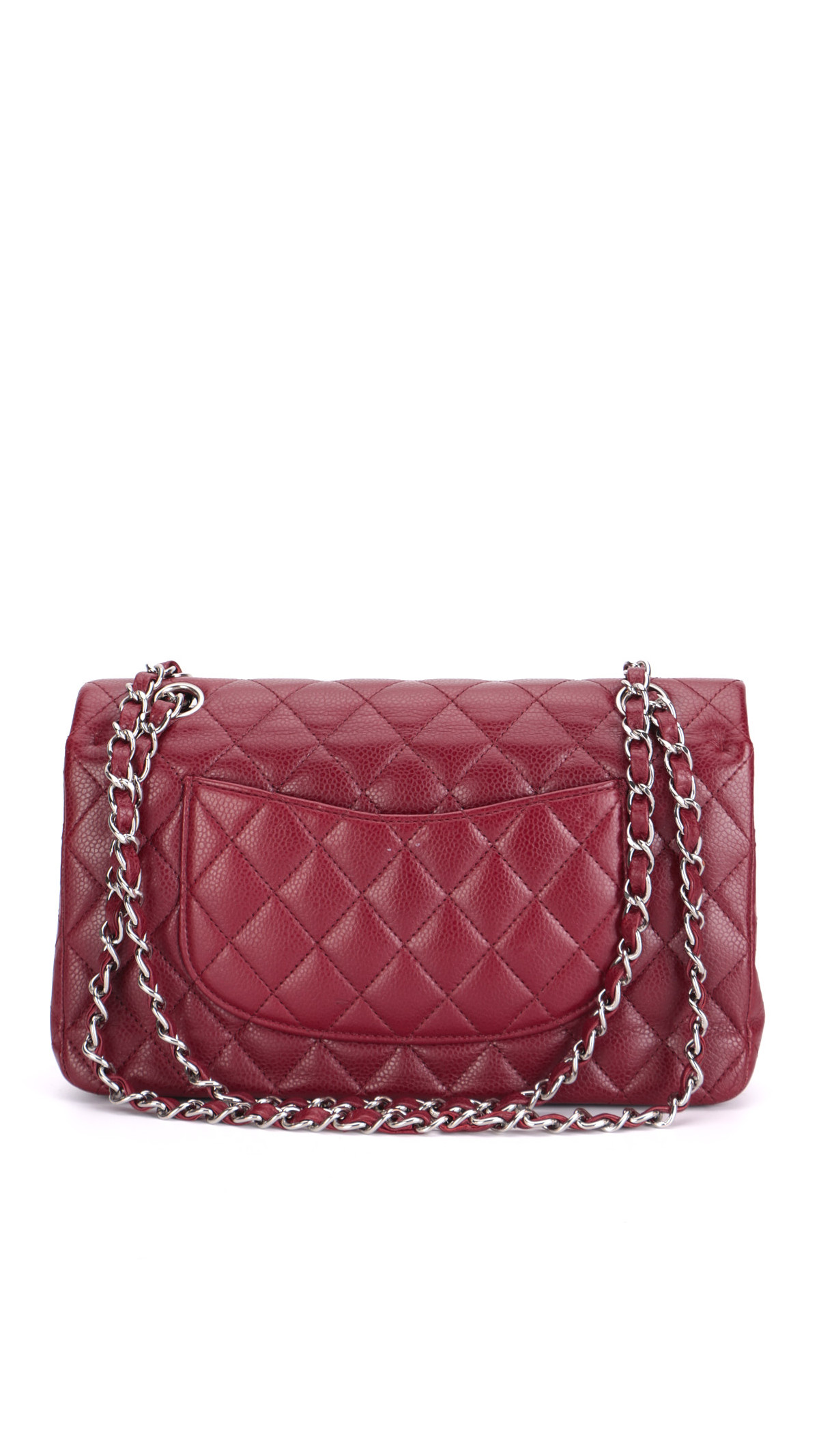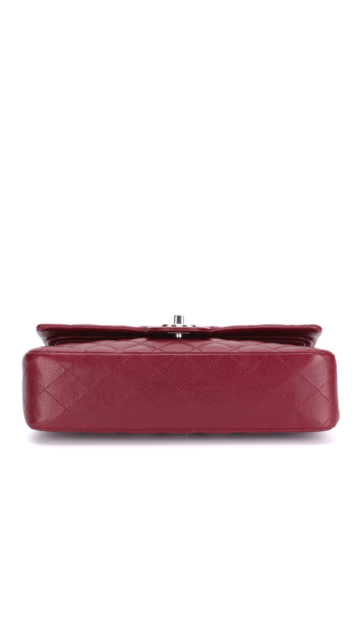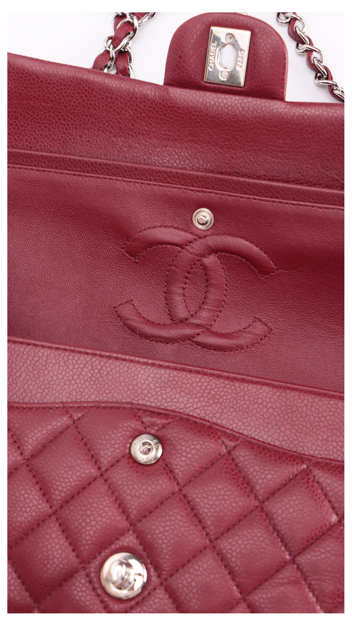 Chanel Classic Double Flap Medium er en av motehusets mest ikoniske vesker – et symbol på tidløs eleganse og utsøkt håndverk. Denne utgaven er laget i burgundfarget, quiltet caviar-skinn med subtil glans og strukturert finish, kombinert med den ikoniske CC-vridlåsen i sølvfarget metall.