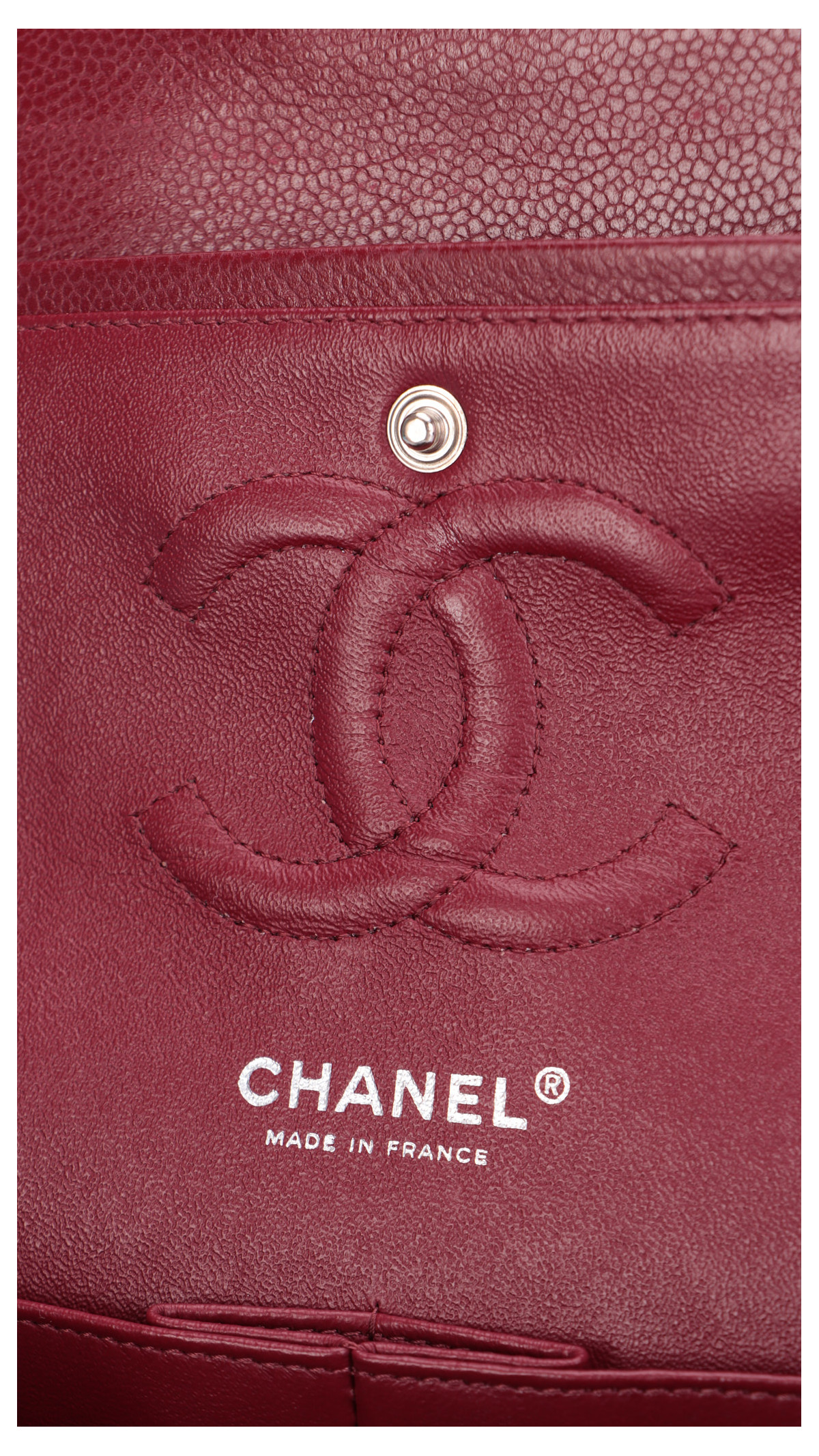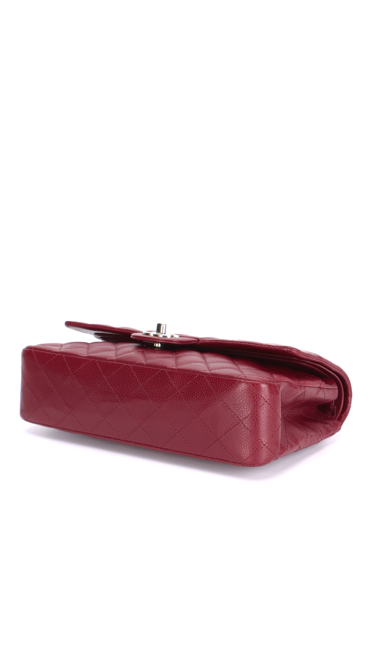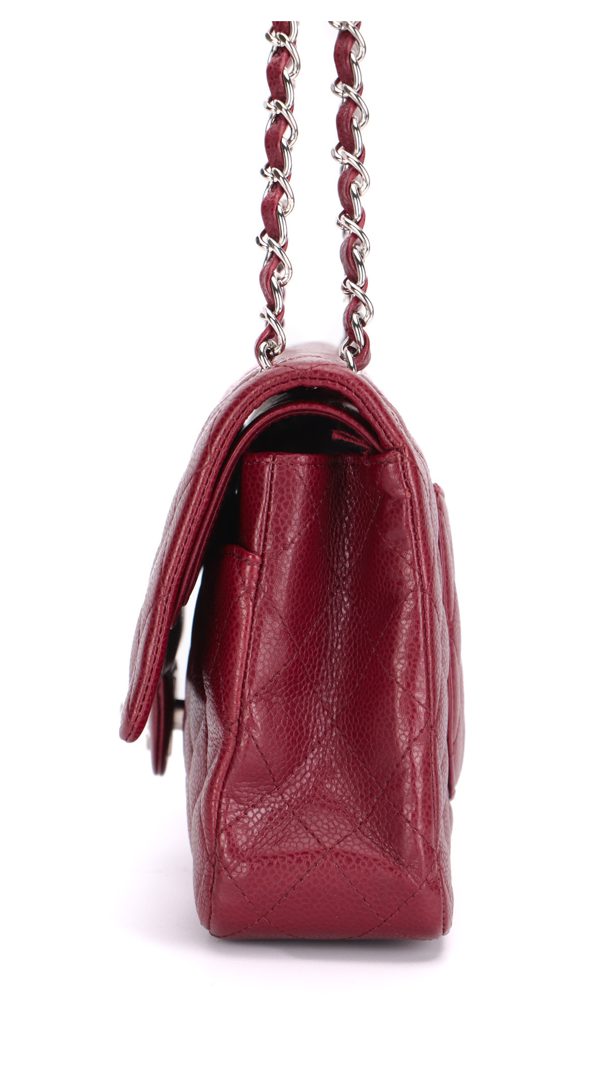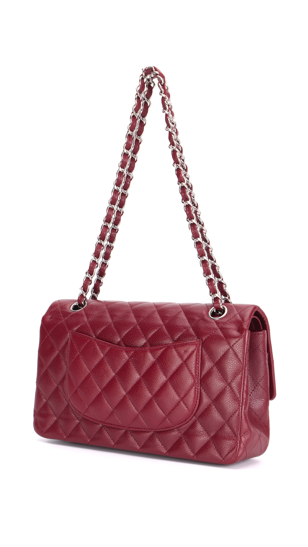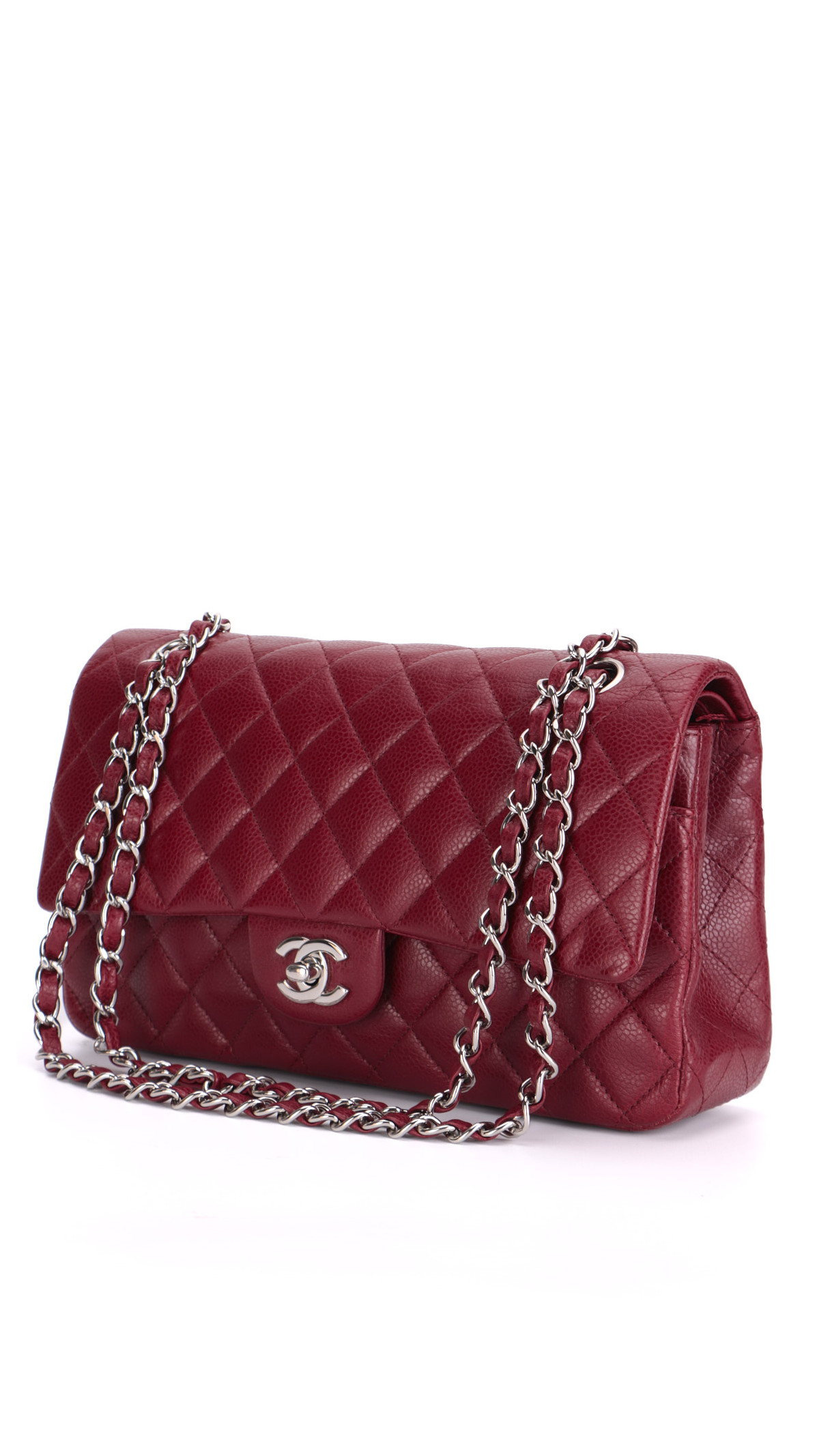 Chanel Classic Double Flap Medium er en av motehusets mest ikoniske vesker – et symbol på tidløs eleganse og utsøkt håndverk. Denne utgaven er laget i burgundfarget, quiltet caviar-skinn med subtil glans og strukturert finish, kombinert med den ikoniske CC-vridlåsen i sølvfarget metall.