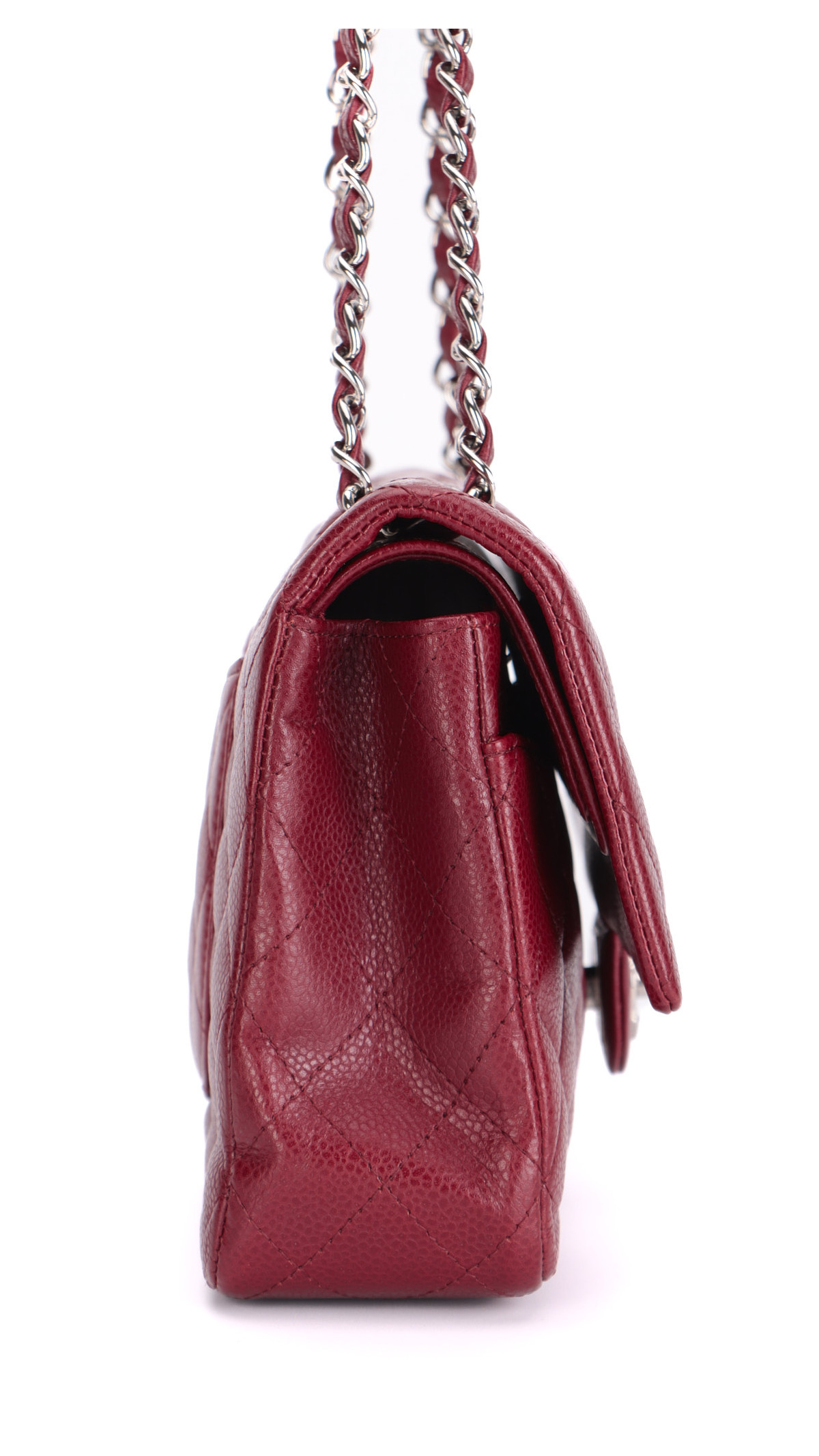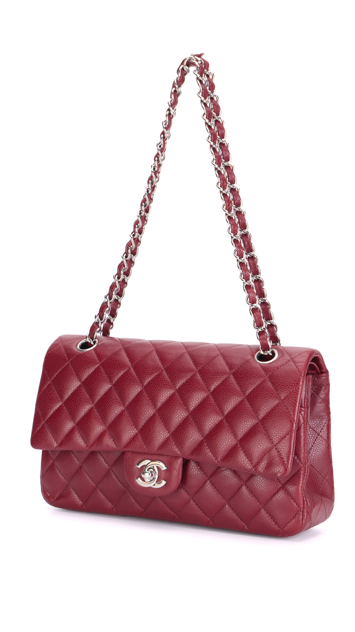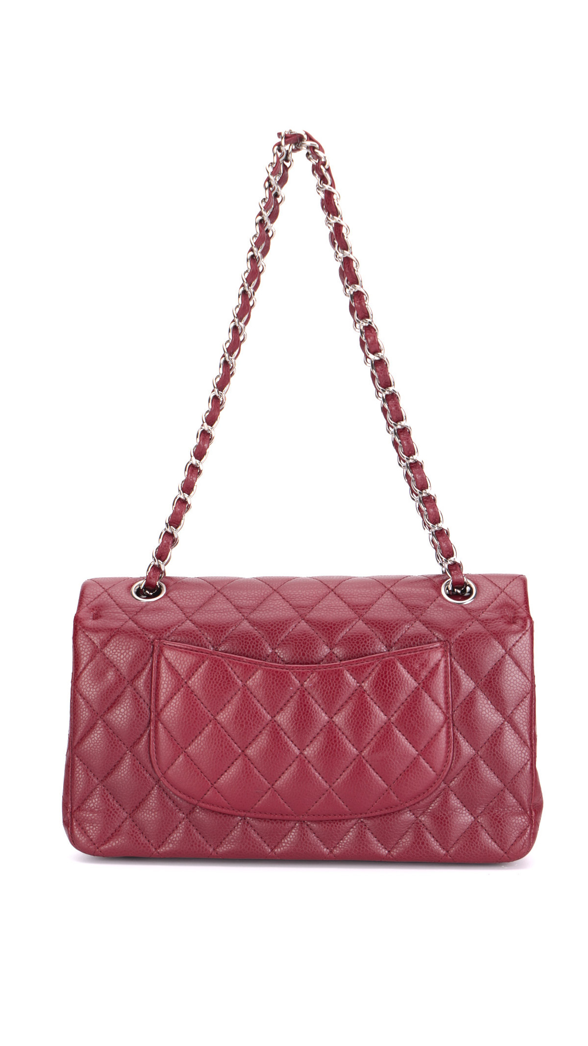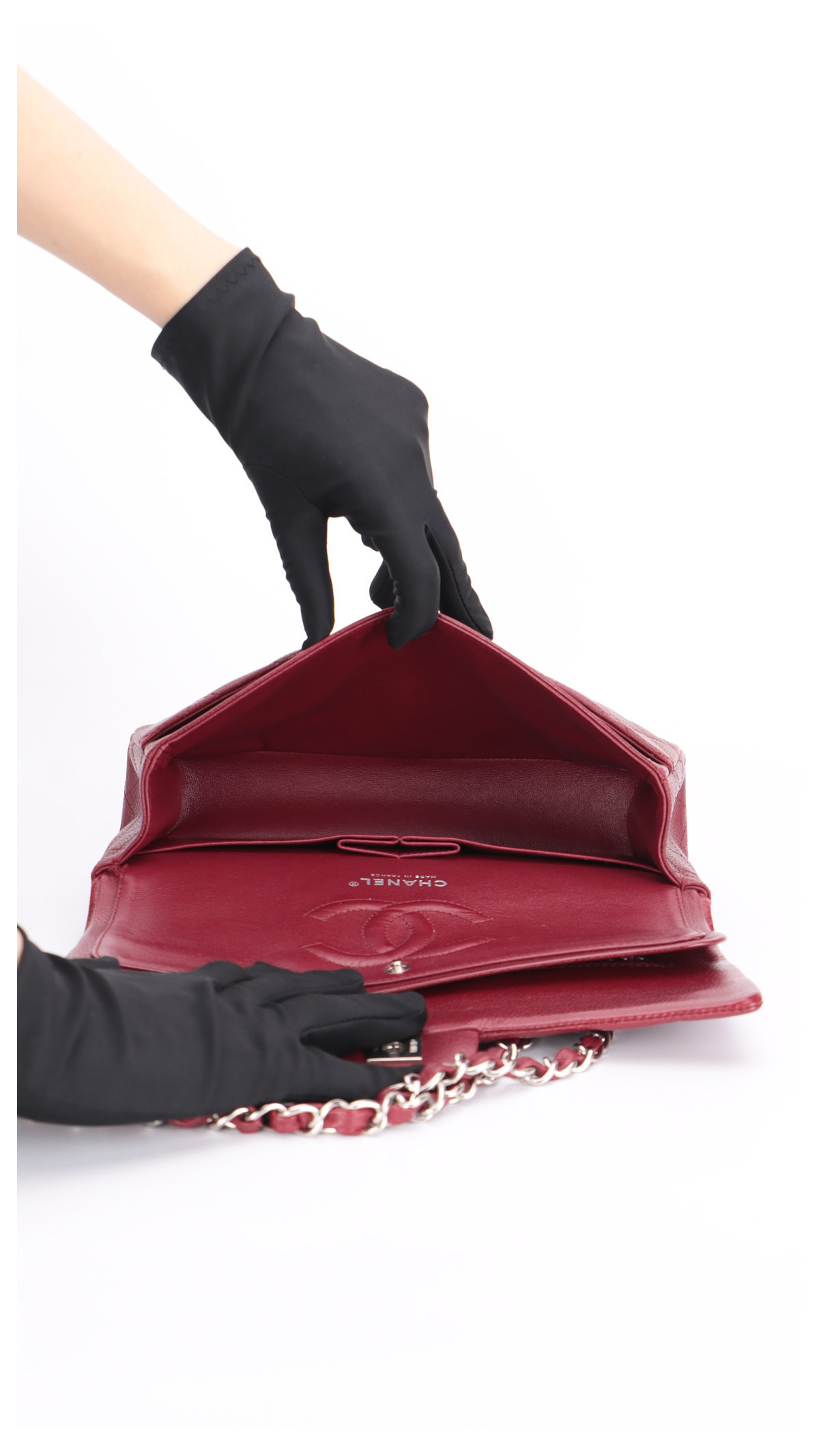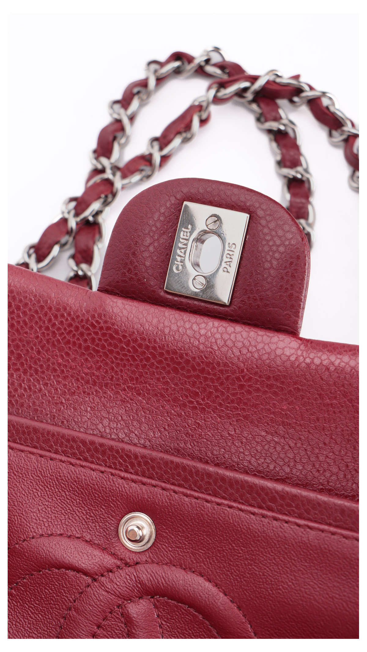 Chanel Classic Double Flap Medium er en av motehusets mest ikoniske vesker – et symbol på tidløs eleganse og utsøkt håndverk. Denne utgaven er laget i burgundfarget, quiltet caviar-skinn med subtil glans og strukturert finish, kombinert med den ikoniske CC-vridlåsen i sølvfarget metall.