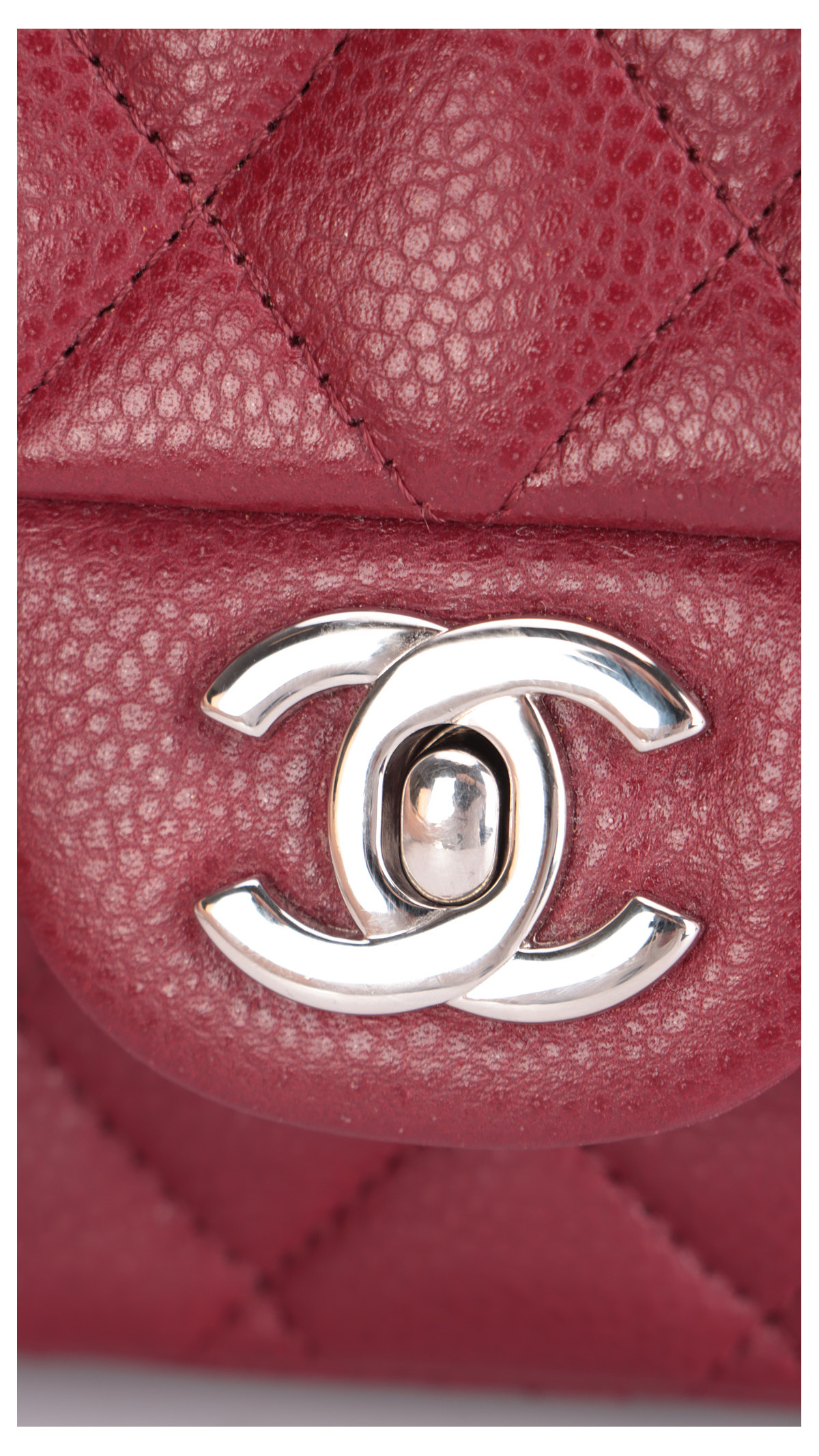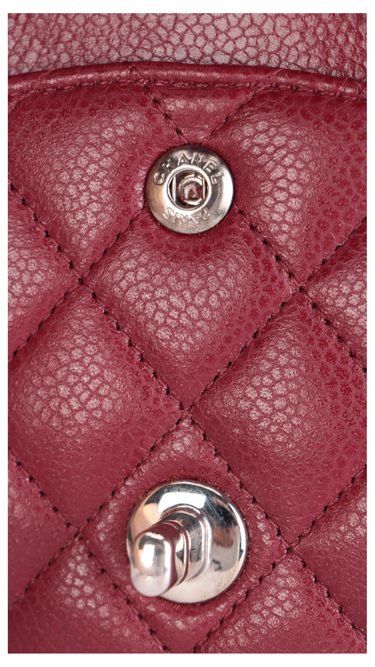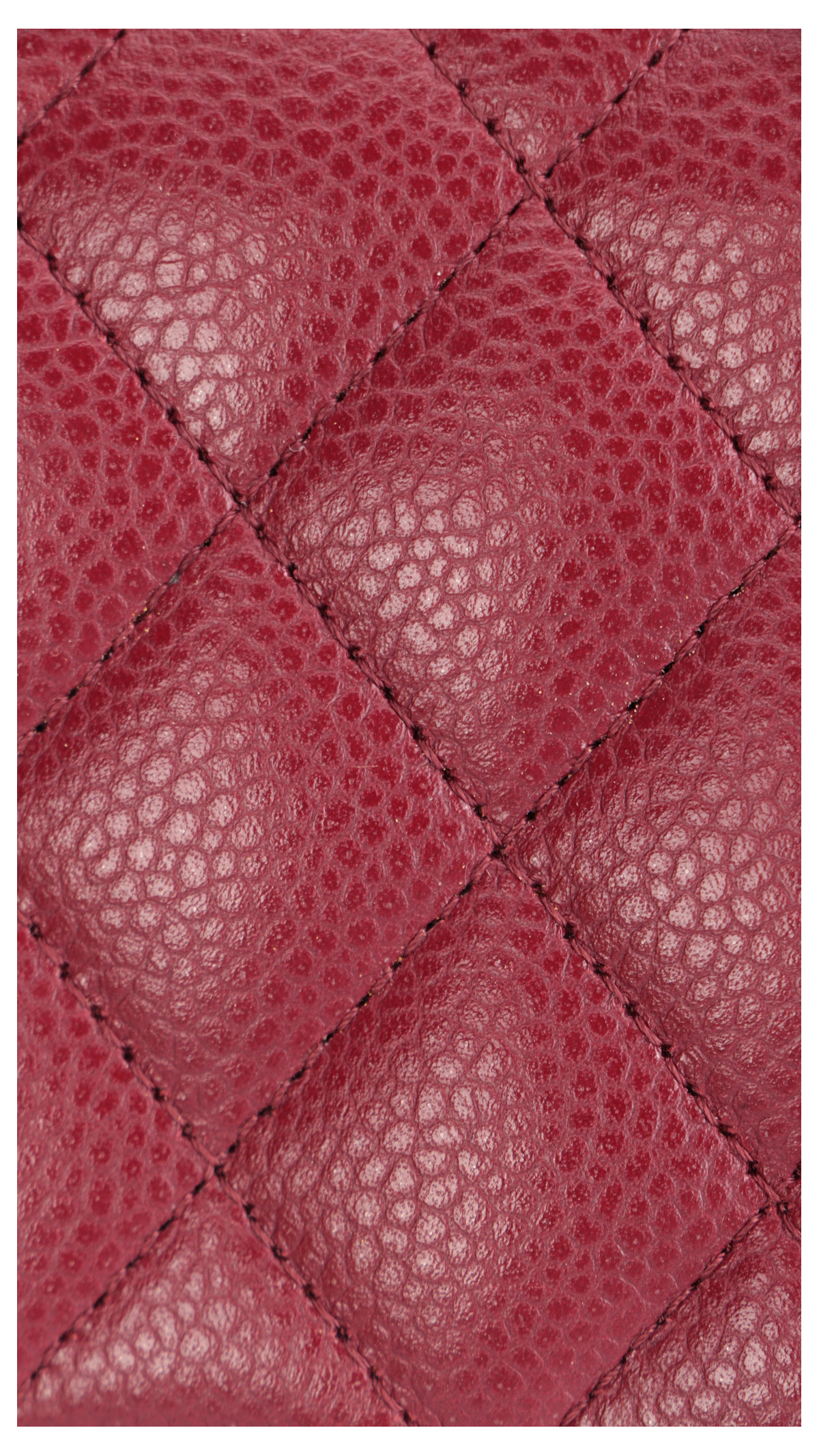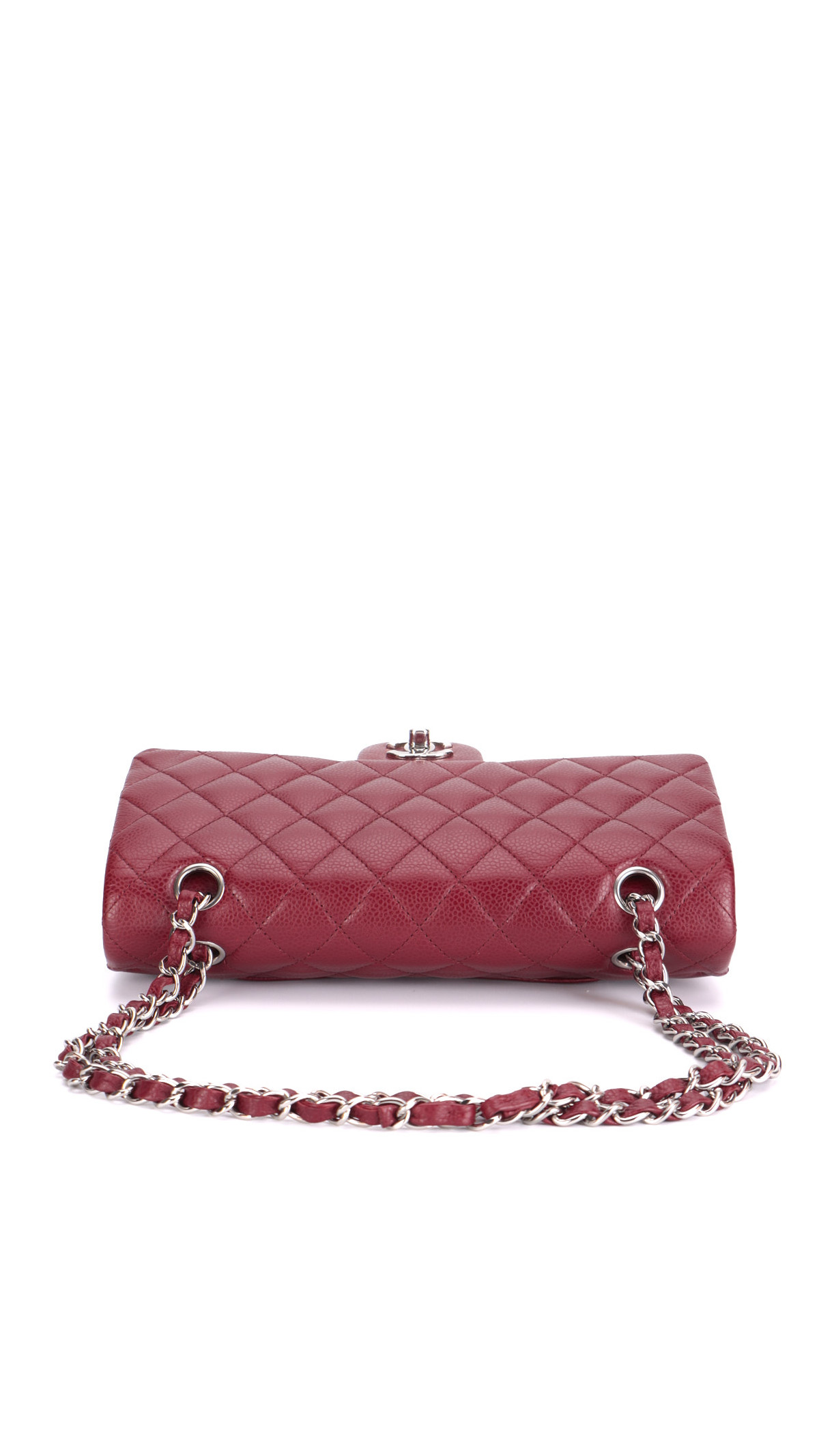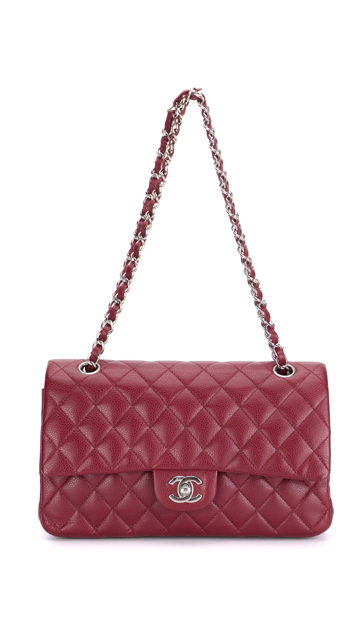 Chanel Classic Double Flap Medium er en av motehusets mest ikoniske vesker – et symbol på tidløs eleganse og utsøkt håndverk. Denne utgaven er laget i burgundfarget, quiltet caviar-skinn med subtil glans og strukturert finish, kombinert med den ikoniske CC-vridlåsen i sølvfarget metall.