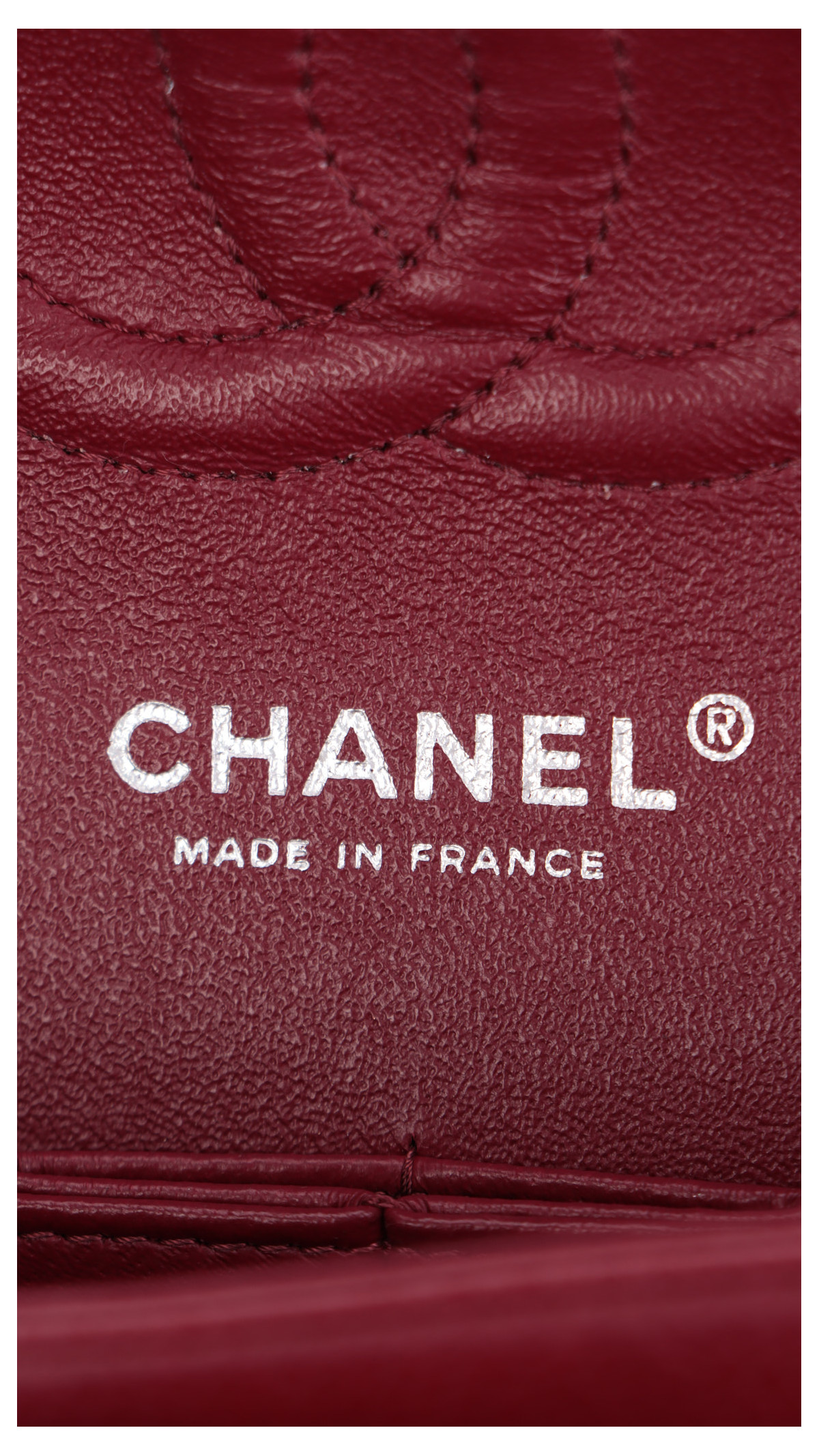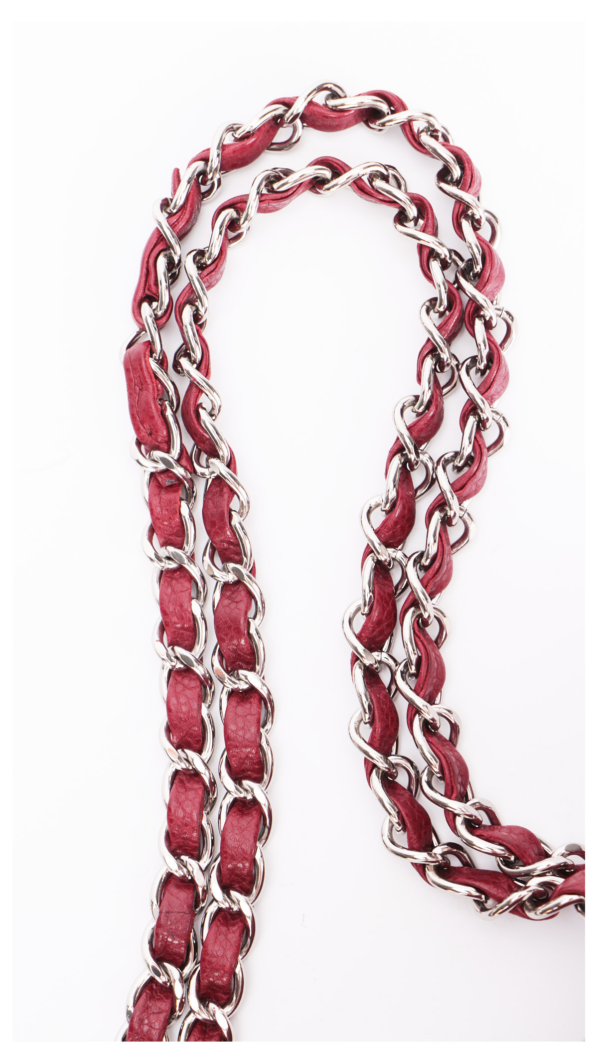 Vesken har den klassiske doble klaffen som beskytter interiøret og gir ekstra formstabilitet. Den flettede lær- og metallkjeden kan bæres både dobbelt over skulderen eller enkelt som crossbody. Innvendig er vesken foret i burgund skinn med flere praktiske lommer, inkludert den ikoniske lommen bak klaffen – en detalj inspirert av Coco Chanels originale design.