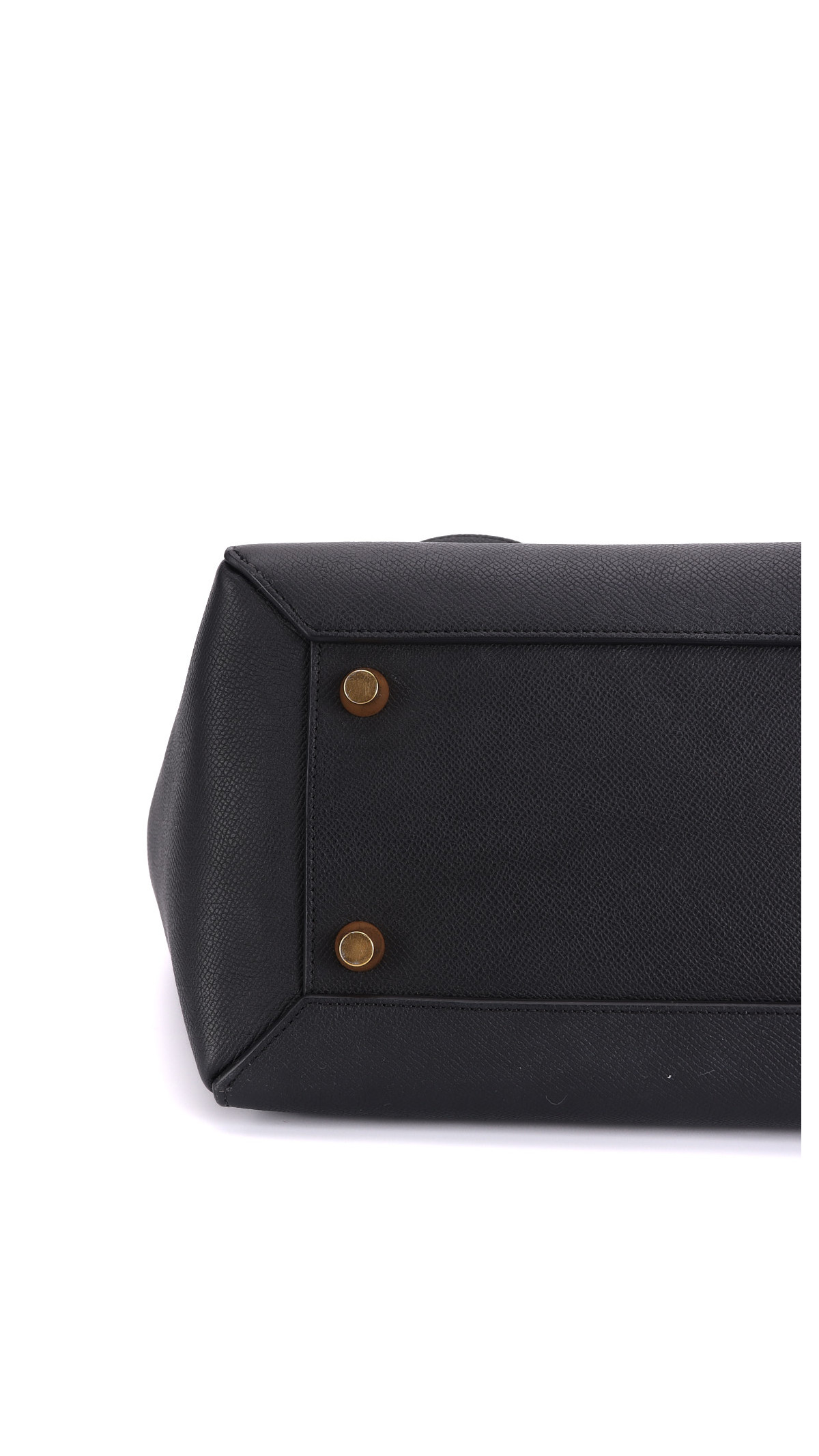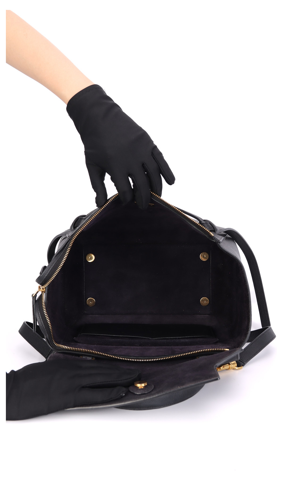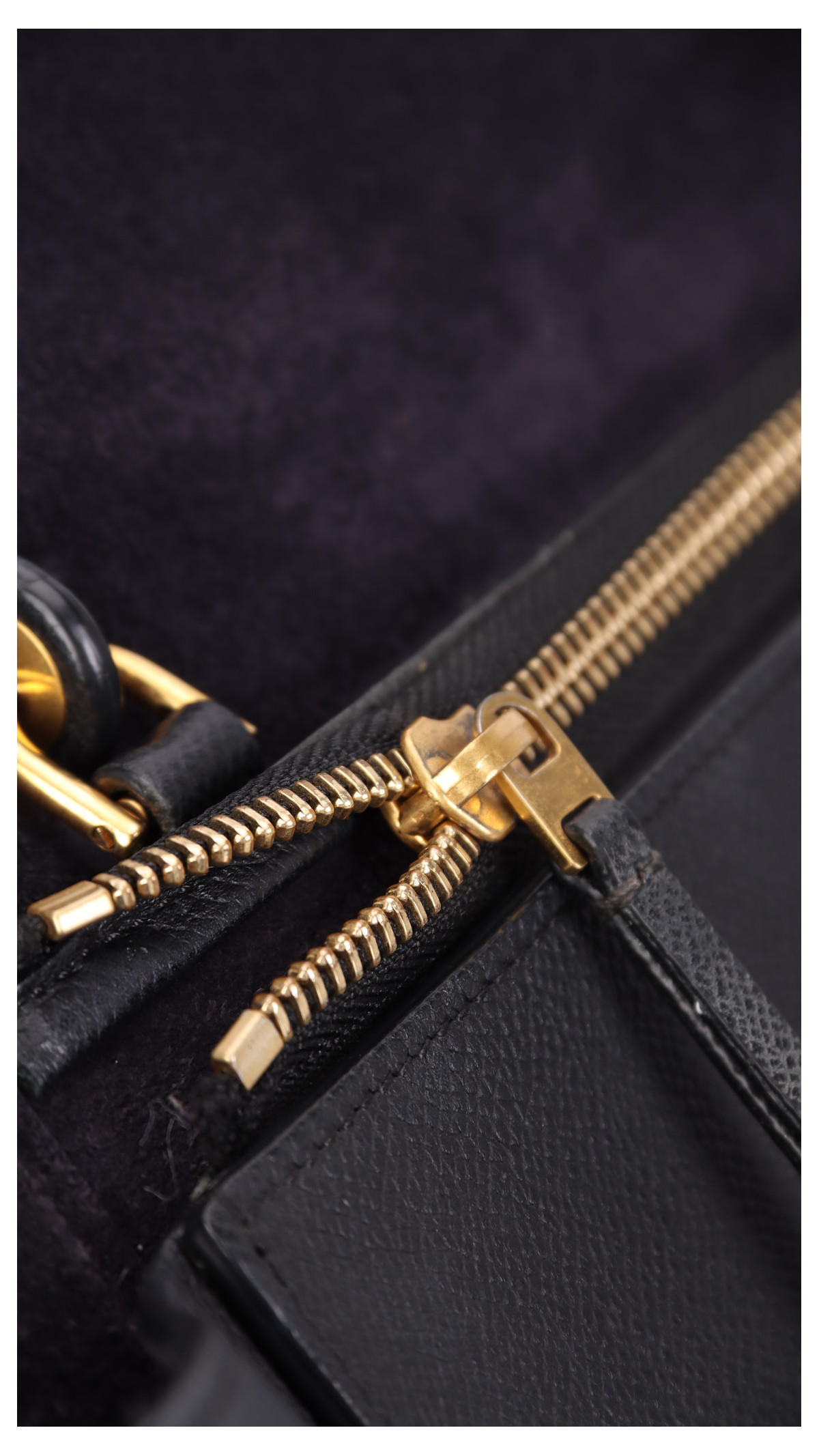 Ikonisk Celine Luggage Tote i en elegant kombinasjon av beige canvas, svart skinn og oransje sidepaneler i mykt kalveskinn. En tidløs veske som kombinerer luksus med funksjonalitet.