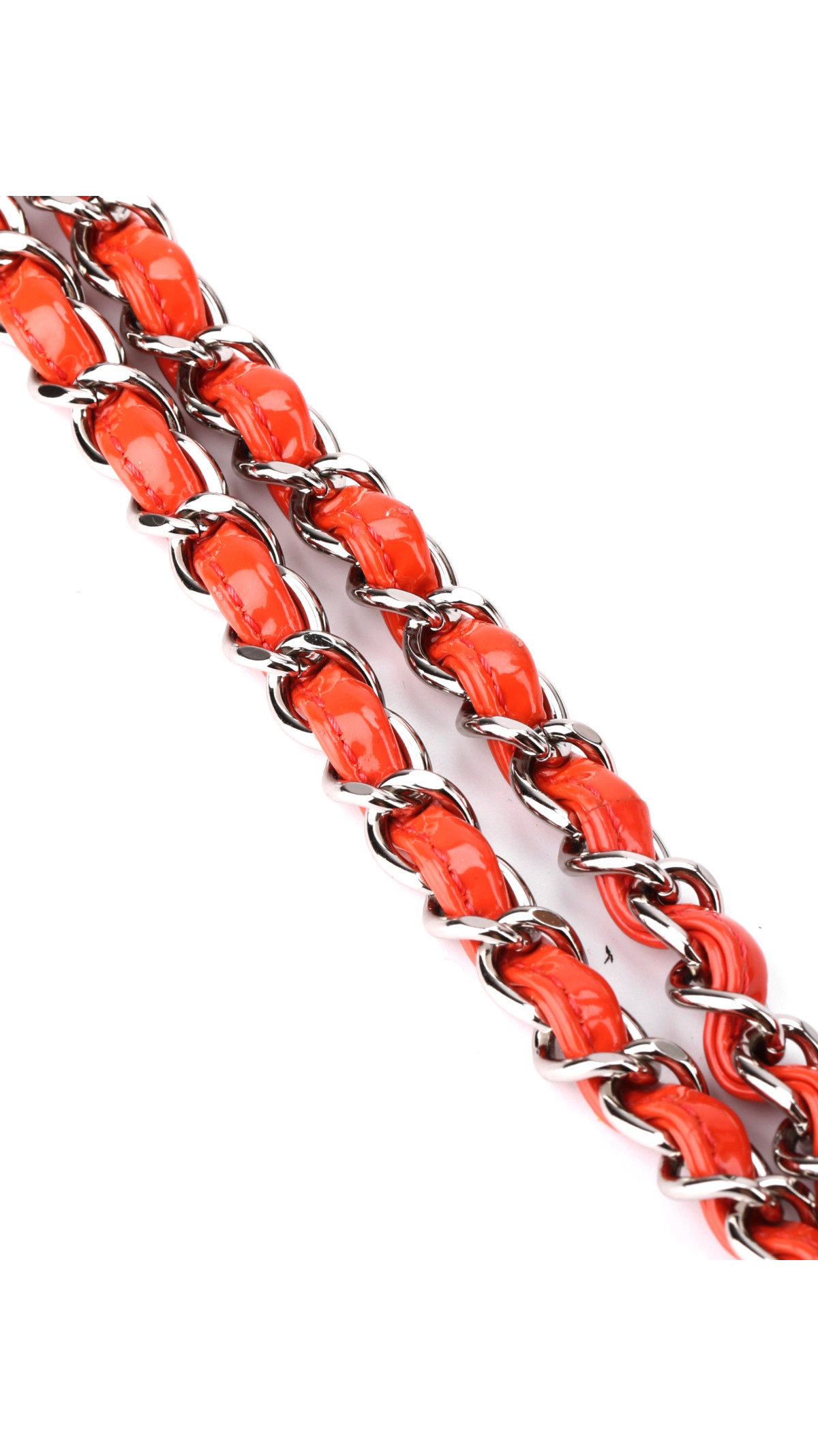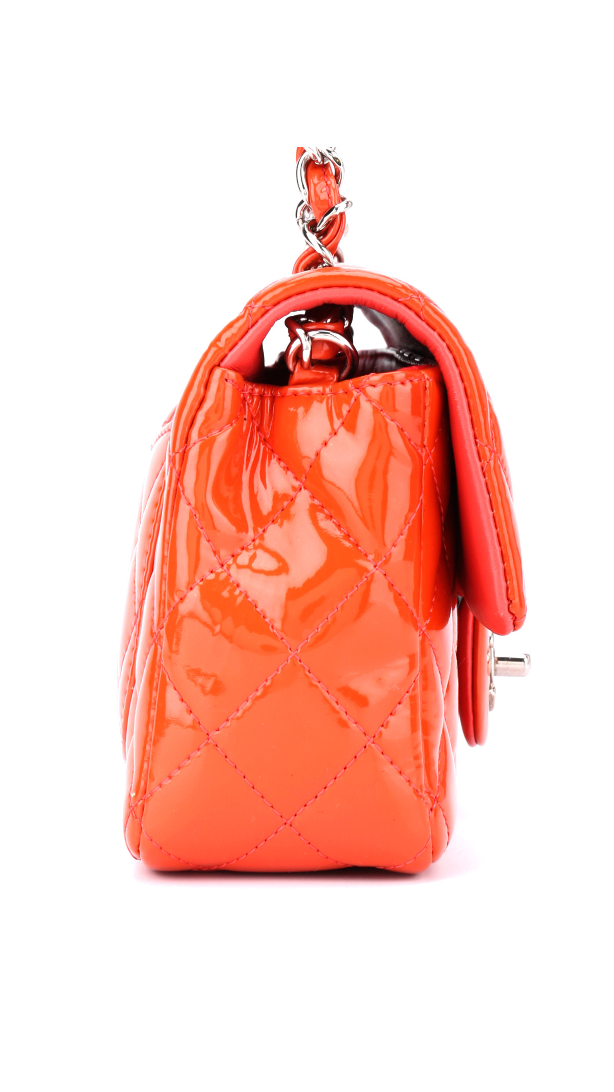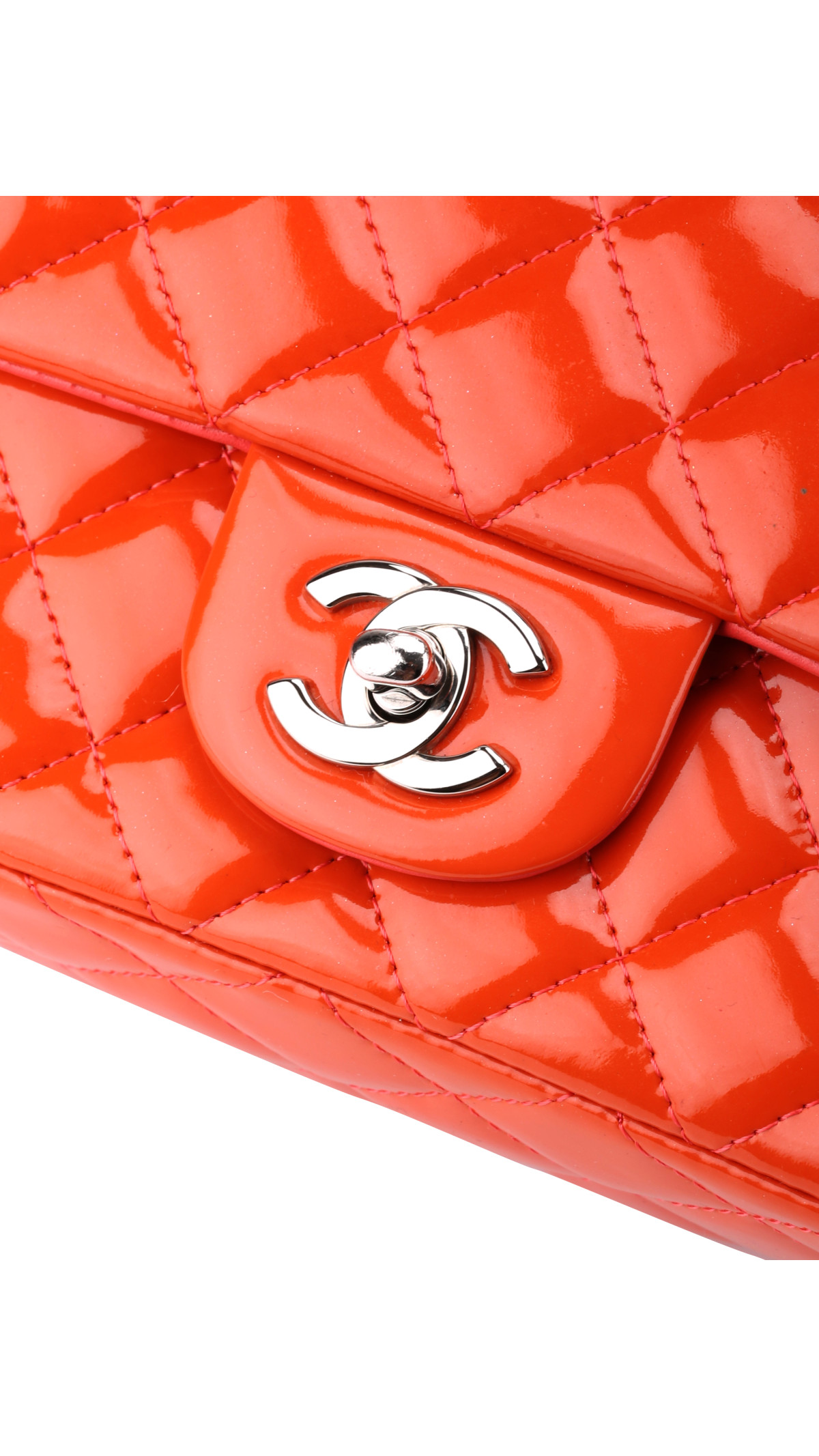 Chanel Classic Flap Bag i oransje patent skinn er en iøynefallende og elegant veske som kombinerer tidløs design med et moderne preg. Det quiltede patent skinnet fremheves av sølvfarget metallhardware og den ikoniske CC-turnlock-låsen i front.