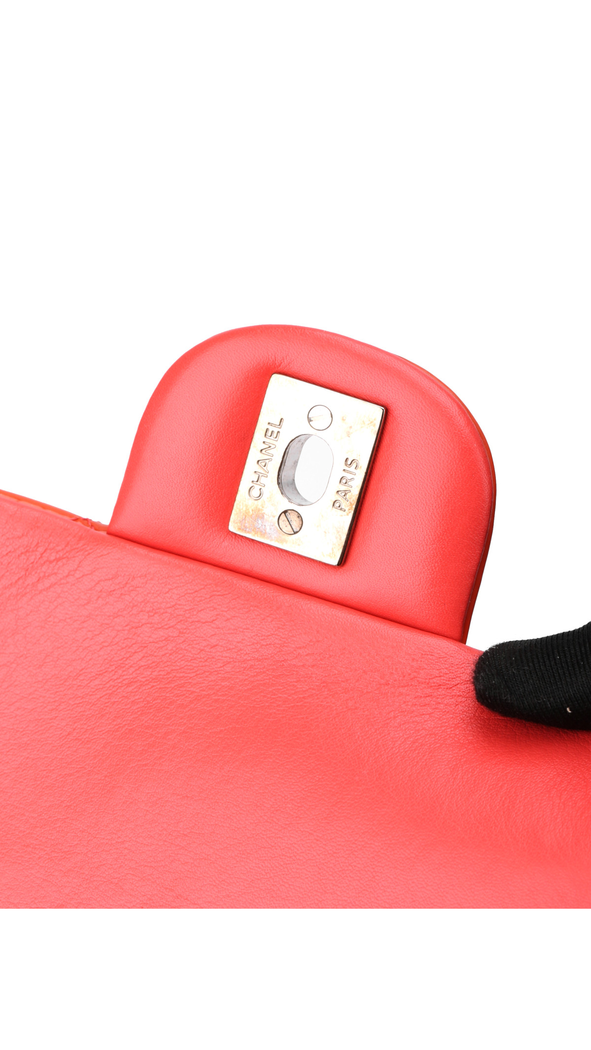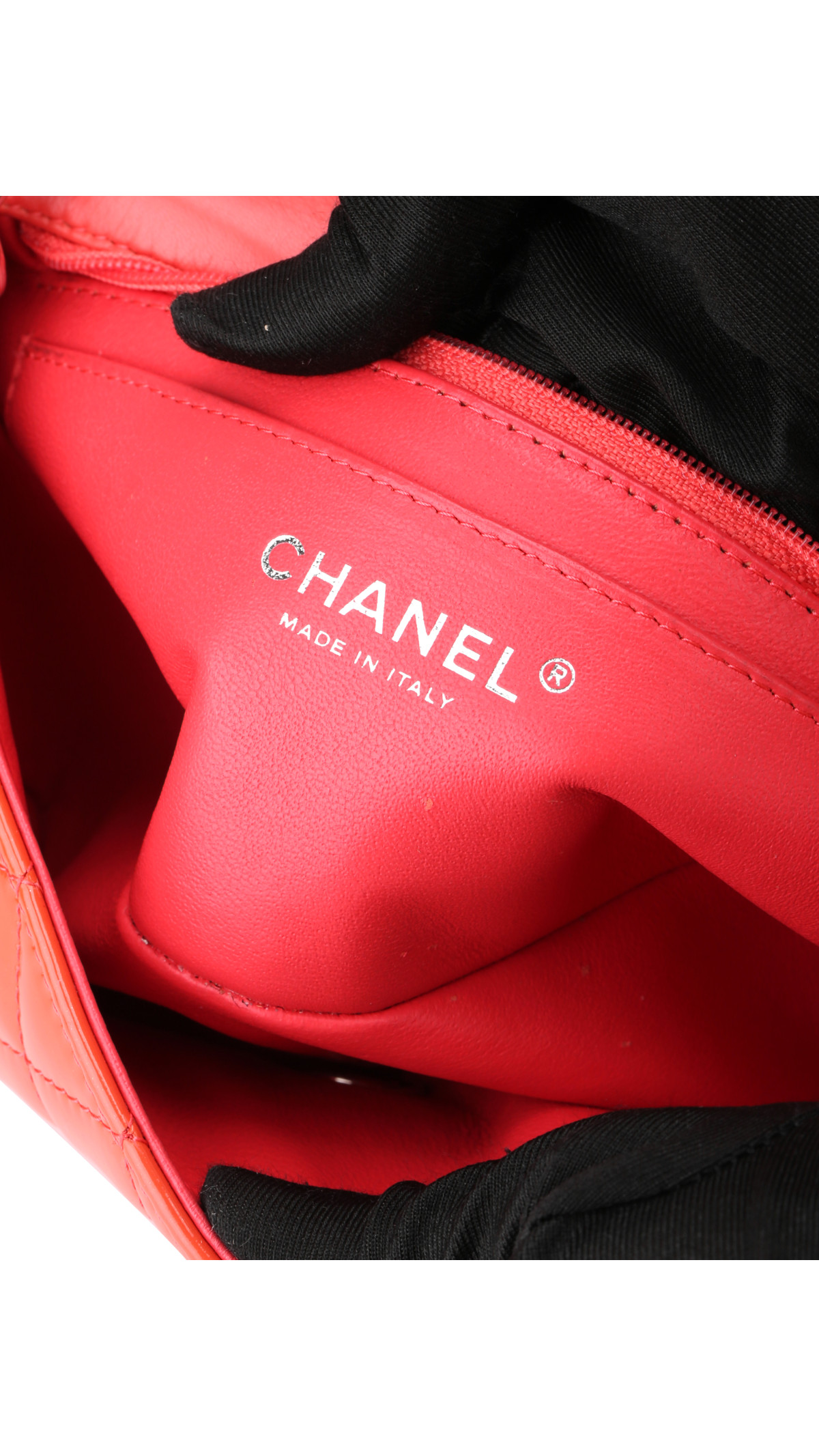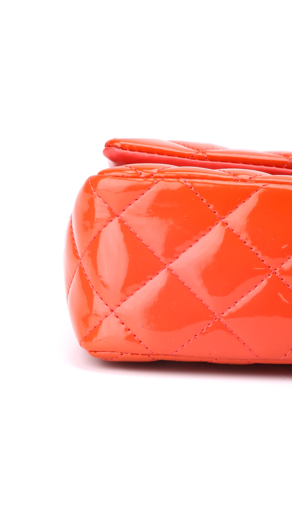 Chanel Classic Flap Bag i oransje patent skinn er en iøynefallende og elegant veske som kombinerer tidløs design med et moderne preg. Det quiltede patent skinnet fremheves av sølvfarget metallhardware og den ikoniske CC-turnlock-låsen i front.